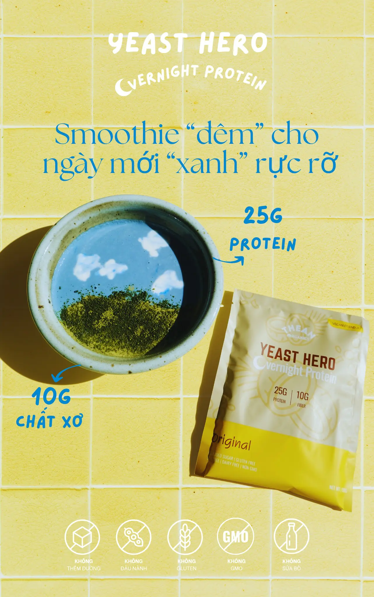Với 1 gói Yeast Hero Overnight Protein ngâm với 100-120ml nước qua đêm, bạn đã có thể sáng tạo ra rất nhiều những công thức smoothie tuyệt vời, có thể giúp bạn thay thế bữa ăn tiện lợi lành mạnh.