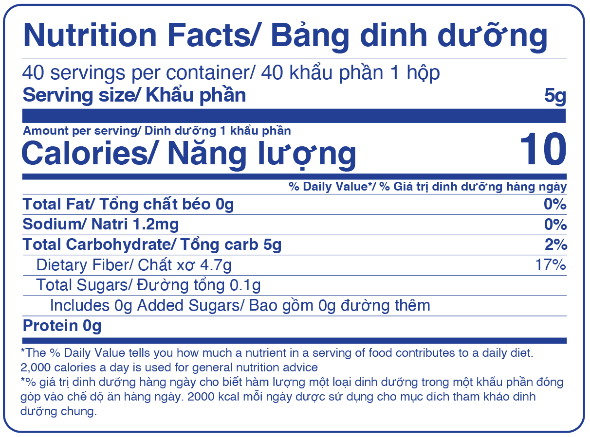 Nhờ vị ngọt nhẹ tự nhiên, dễ hòa tan và trung tính, Inulin là một thành phần linh hoạt có thể thêm vào nước, cà phê, sinh tố, sữa hạt, sữa chua, yến mạch qua đêm hoặc các công thức nấu ăn lành mạnh, giúp tăng hàm lượng chất xơ mà không làm thay đổi nhiều hương vị.