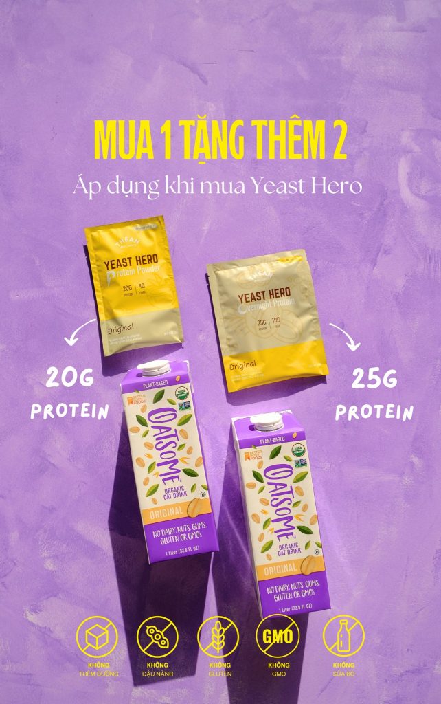 Áp dụng đến hết 31/10: Mua 1 hộp protein Yeast Hero được tặng 2 hộp sữa yến mạch hữu cơ Oatsome.